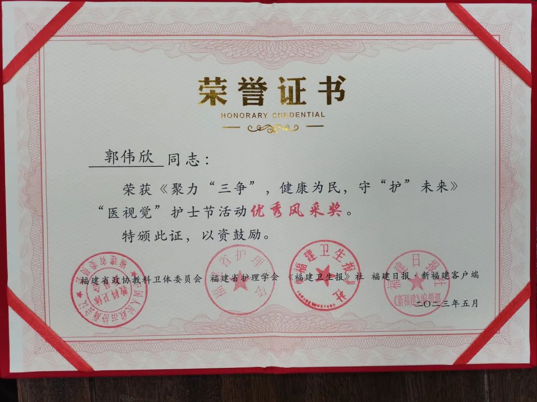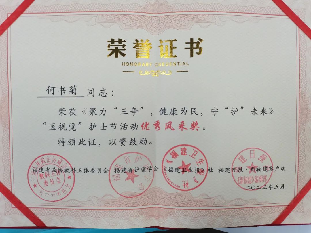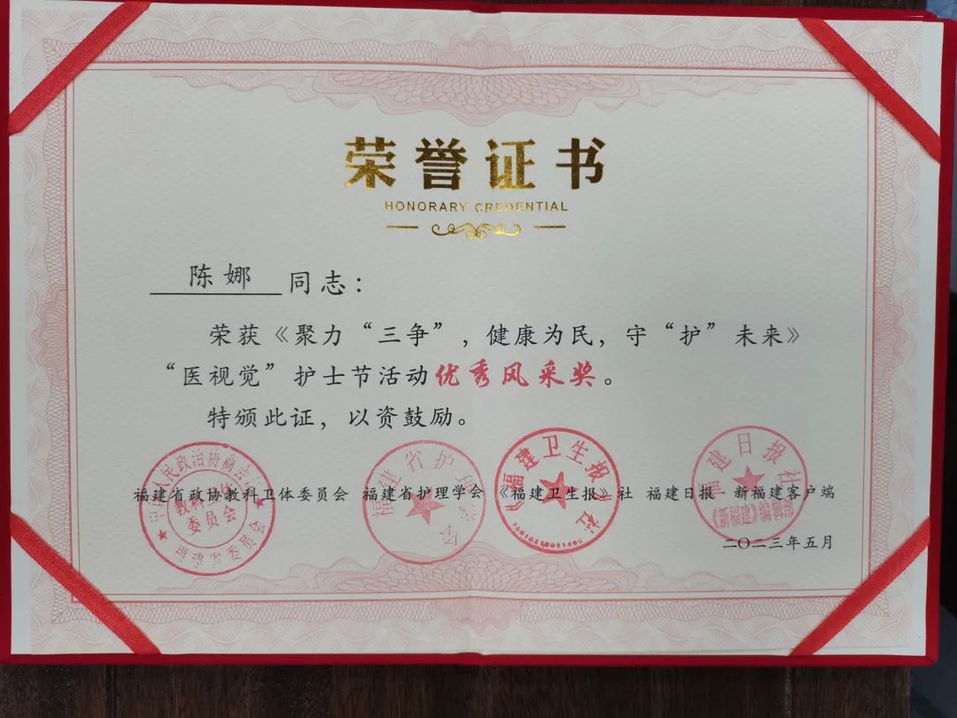 2023年“醫(yī)視覺”護(hù)士節(jié)特輯——“聚力'三爭',健康為民,守'護(hù)'未來”主題活動,由福建省政協(xié)教科衛(wèi)體委員會、福建省護(hù)理學(xué)會、《福建衛(wèi)生報》社、福建日報·新福建客戶端聯(lián)合啟動,向全省各級衛(wèi)生醫(yī)療機(jī)構(gòu)征集圖片。經(jīng)評選,醫(yī)院護(hù)理部、宣傳部選送的三個參賽作品獲得優(yōu)秀獎,展現(xiàn)了醫(yī)院護(hù)理團(tuán)隊(duì)的南丁格爾精神和人道、博愛、奉獻(xiàn)的職業(yè)精神,彰顯了新時代護(hù)理工作者的白衣風(fēng)采。