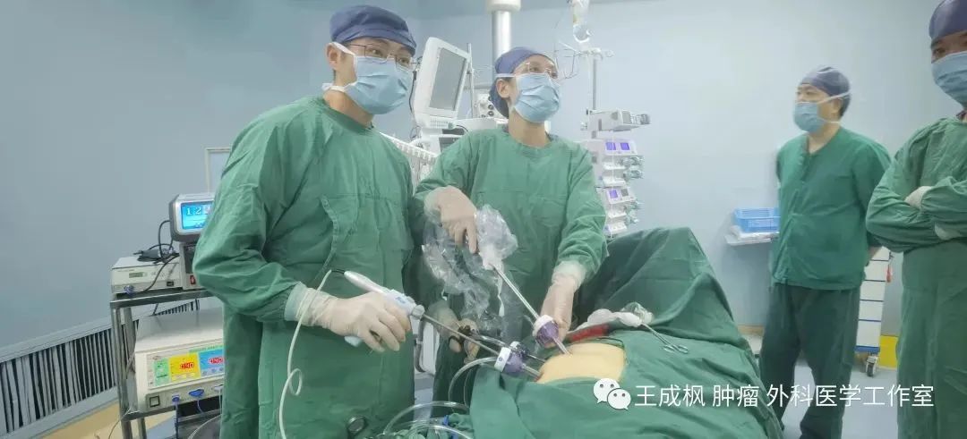 患者是一位42歲女性,術(shù)前影像學(xué)和腸鏡檢查確診乙狀結(jié)腸癌。經(jīng)過(guò)各項(xiàng)術(shù)前準(zhǔn)備及科室討論,在余養(yǎng)生主任醫(yī)師的指導(dǎo)下,王成楓副主任醫(yī)師手術(shù)團(tuán)隊(duì)決定為患者行三孔腹腔鏡手術(shù)治療。在胃腸外科及麻醉科的協(xié)同合作下,順利完成三孔腹腔鏡乙狀結(jié)腸切除術(shù),手術(shù)出血10ml,術(shù)后第1日患者即可獨(dú)立下床活動(dòng),第2日即排氣排便并進(jìn)食,術(shù)后第4日康復(fù)出院。目前患者正進(jìn)行定期的抗腫瘤化療。
