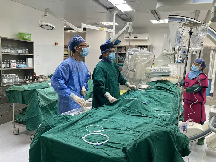 心內(nèi)科林超、石洪、林飛寧副主任醫(yī)師,與導管室林曉燕主管護師、林志捷技師接到胸痛中心電話,冒著暴雨,快速趕到醫(yī)院,緊急開展急診介入手術。經(jīng)過急診人員的密切配合下,迅速開通患者右冠血管,血流恢復,挽救了患者的生命。
