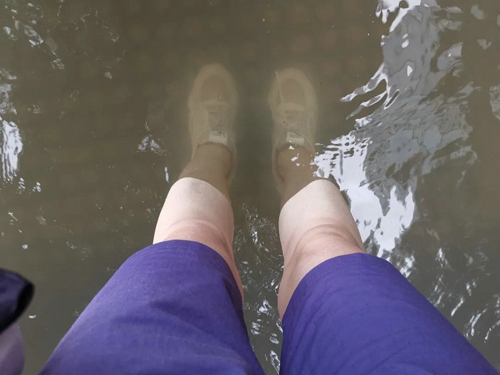 科室負責人張麗楓醫(yī)生涉水上班,路上換了三輛共享單車,接著蹚水步行將近兩個小時,鞋子直接泡水報廢了。她說:“今天有病人做動態(tài)心電圖,已經(jīng)約好了,怕病人來了我們沒在?!?