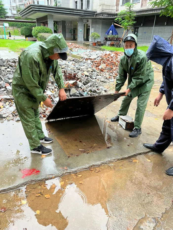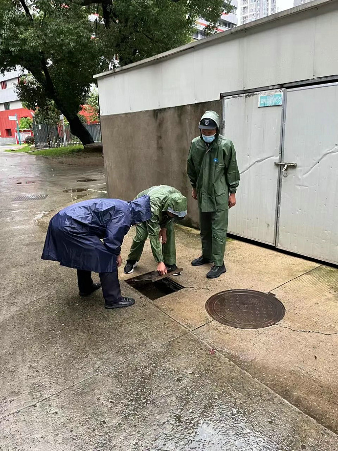 昨夜暴雨,保衛(wèi)處連夜加強安全巡查工作。保安隊長帶隊,并加派4名安保人員對全院的安全進行巡查。凌晨3點半,隊長安排好工作才回警務室休息,早上6點又開始巡查。在巡查中發(fā)現(xiàn)大量窨井蓋被水頂開,為防止人員車輛陷進井里,保安隊長冒雨用沙袋壓住井蓋,并用反光錐等進行警示。晚上,值班人員發(fā)現(xiàn)3號樓CT室內(nèi)積水有可能漫進操作室,立即找來清掃工具清除積水。此外,保安隊長帶領隊員協(xié)助后勤處,對重點的位置(發(fā)熱門診的CT室、7號樓地下停車庫)也進行了巡查。
