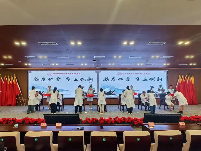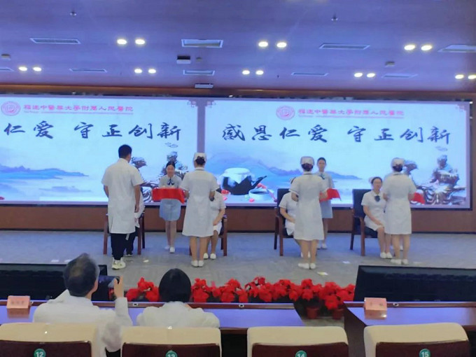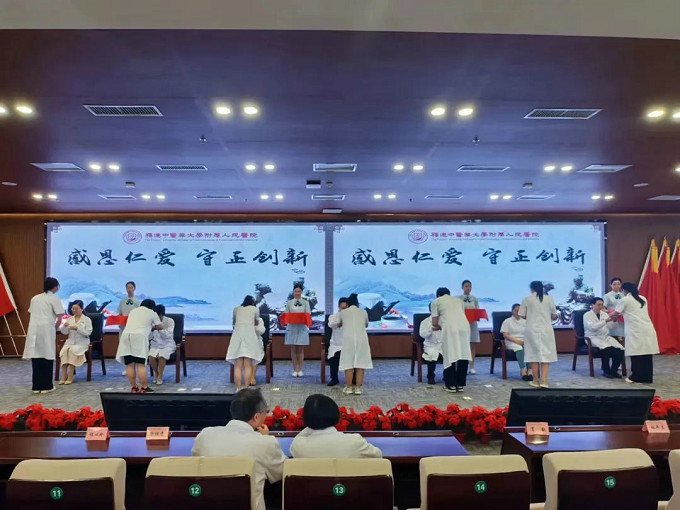 拜師儀式圓滿結(jié)束。程心玲副院長(zhǎng)、徐順貴副院長(zhǎng)帶領(lǐng)各位老師和同學(xué)們進(jìn)行大醫(yī)精誠(chéng)宣誓。