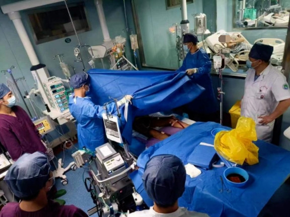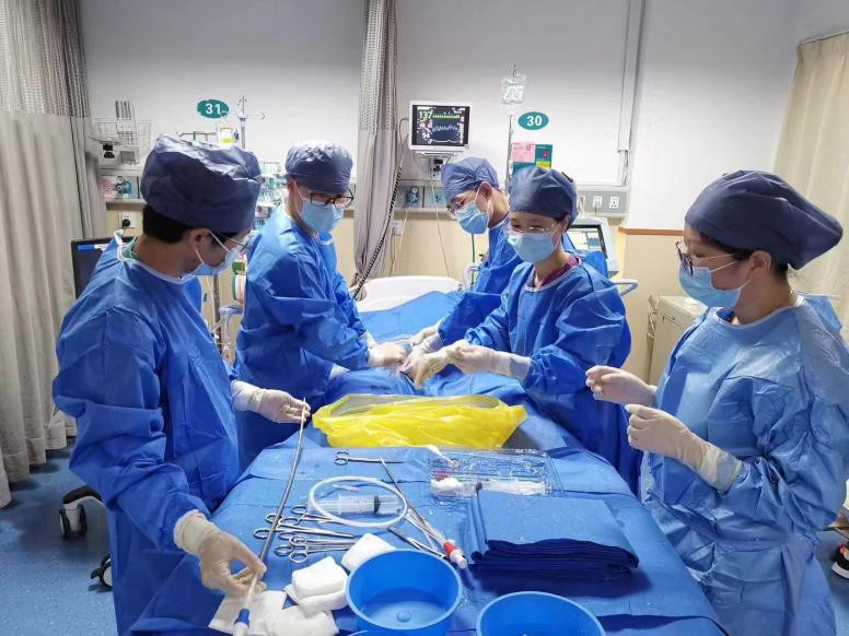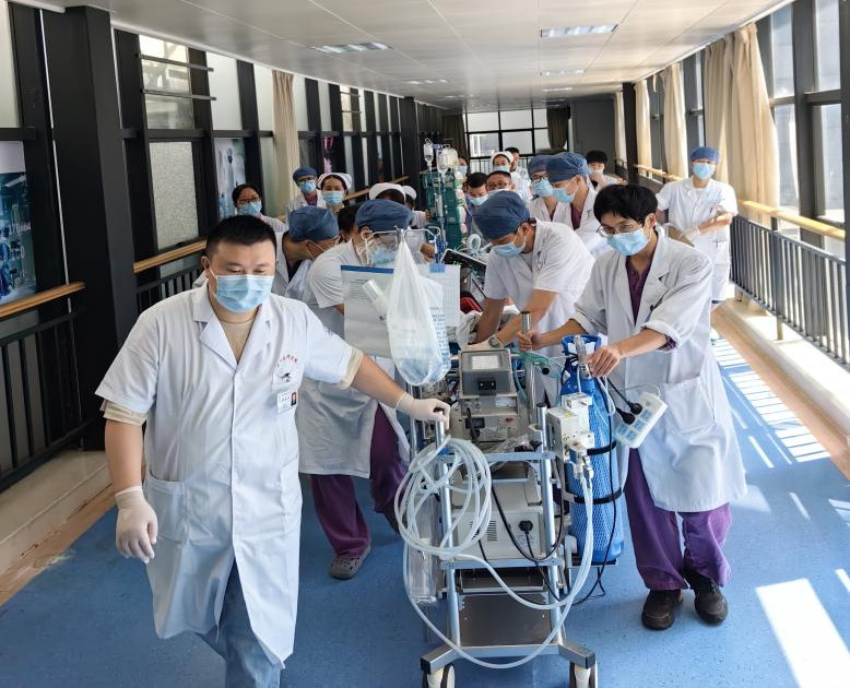 入院幾個小時內(nèi),翁某病情迅速進(jìn)展,心臟收縮極其微弱,循環(huán)塌陷,只能依靠大劑量升壓藥物維持血壓,超聲提示心臟射血分?jǐn)?shù)僅為正常的15%,隨時可能心臟、呼吸驟停。重癥醫(yī)學(xué)科緊急會診后,立即進(jìn)行了氣管插管、機(jī)械通氣,床旁實時超聲提示,患者心臟衰竭仍在進(jìn)一步加重,血壓難以測出,生命垂危。李紅艷主任帶領(lǐng)團(tuán)隊進(jìn)行全面評估,判斷需要立即行ECMO(體外膜肺氧合)治療。在征得家屬同意后,搶救工作有序開展,團(tuán)隊成員以最快速度攜帶ECMO設(shè)備及所需用物趕往心血管科,在床旁進(jìn)行置管、VA-ECMO上機(jī)。暗紅色的血液在ECMO轉(zhuǎn)動下,轉(zhuǎn)為鮮紅,患者生命征逐漸平穩(wěn),隨后被安全轉(zhuǎn)運至ICU繼續(xù)治療。這也是我院第一例在普通病房緊急床旁置管、上機(jī)再執(zhí)行轉(zhuǎn)運的案例。