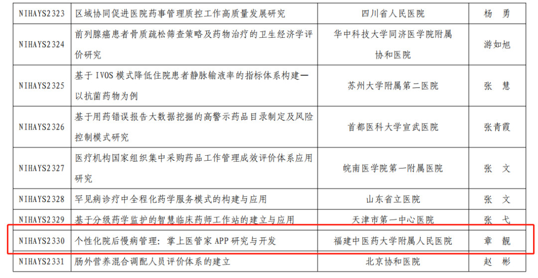 近日,國(guó)家衛(wèi)生健康委醫(yī)院管理研究所公布2023年醫(yī)院藥學(xué)高質(zhì)量發(fā)展研究項(xiàng)目立項(xiàng)名單。此次研究項(xiàng)目遴選面向全國(guó),綜合考慮項(xiàng)目的“科學(xué)性、創(chuàng)新性、可行性”以及對(duì)醫(yī)院藥學(xué)高質(zhì)量發(fā)展的推動(dòng)作用,經(jīng)過(guò)形式審查、專(zhuān)家函審和現(xiàn)場(chǎng)答辯,全國(guó)共遴選出34個(gè)項(xiàng)目立項(xiàng)。我院藥學(xué)部臨床藥學(xué)室副主任藥師章靚申報(bào)的《個(gè)性化院后慢病管理:掌上醫(yī)管家APP研究與開(kāi)發(fā)》獲批立項(xiàng),為我省唯一立項(xiàng)項(xiàng)目。