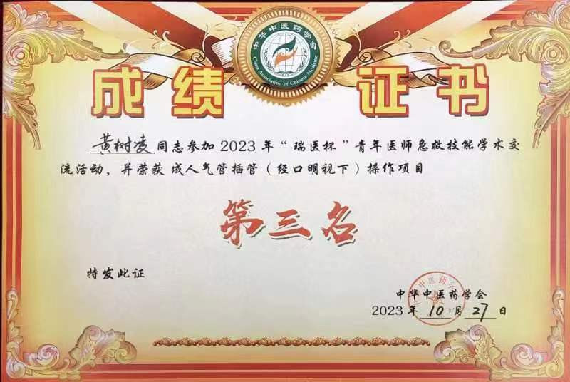 福建1隊(duì)黃樹凌榮獲成人氣管插管(經(jīng)口視下)操作第三名