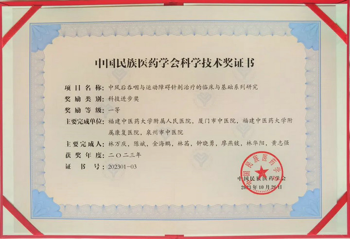 我院針灸療法創(chuàng)新團(tuán)隊(duì)林萬(wàn)慶主任項(xiàng)目組的研究成果《中風(fēng)后吞咽與運(yùn)動(dòng)障礙針刺治療的臨床與基礎(chǔ)系列研究》榮獲2023年度中國(guó)民族醫(yī)藥學(xué)會(huì)科學(xué)技術(shù)獎(jiǎng)一等獎(jiǎng)。