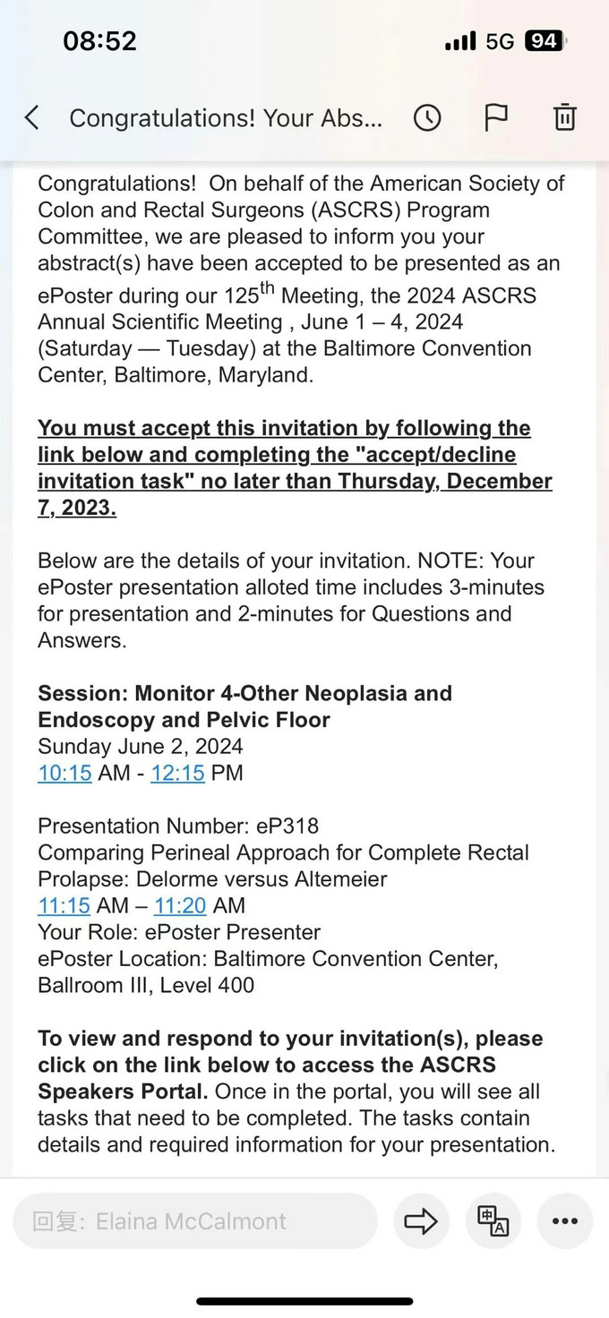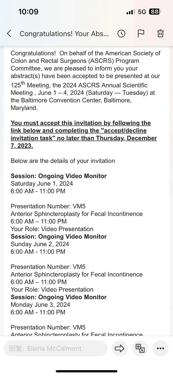 美國結(jié)直腸外科醫(yī)師協(xié)會(huì) (American Society of Colorectal Surgeons,ASCRS) 年會(huì)是全球規(guī)模最大的結(jié)直腸外科領(lǐng)域盛會(huì),每年都會(huì)吸引來自全世界的眾多該領(lǐng)域的精英參會(huì),被譽(yù)為國際結(jié)直腸外科的“奧斯卡盛典”。該會(huì)議將于2024年6月1-4日在美國巴爾的摩舉辦,大會(huì)涵蓋了結(jié)直腸外科的最新進(jìn)展、??漆t(yī)師培訓(xùn)、繼續(xù)教育、患者健康管理等諸多方面的內(nèi)容。能入圍的作品都是經(jīng)過國際評(píng)審專家多次審核,層層篩選,獲國際同行認(rèn)可。此次入選,是福建省中醫(yī)肛腸再次在世界首屈一指的學(xué)術(shù)會(huì)議平臺(tái)上展播手術(shù)和研究成果,向更多的國際、國內(nèi)同行展示我院肛腸科精湛的醫(yī)療技術(shù)與優(yōu)秀的科研能力,加強(qiáng)與國際同行之間的交流學(xué)習(xí),擴(kuò)大學(xué)科學(xué)術(shù)影響力。