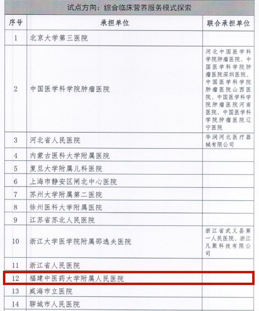 近日,國(guó)家衛(wèi)生健康委醫(yī)院管理研究所公布首批臨床營(yíng)養(yǎng)科建設(shè)試點(diǎn)單位名單,福建中醫(yī)藥大學(xué)附屬人民醫(yī)院(試點(diǎn)方向:綜合臨床營(yíng)養(yǎng)服務(wù)模式探索)成功入圍,成為臨床營(yíng)養(yǎng)科建設(shè)試點(diǎn)單位。