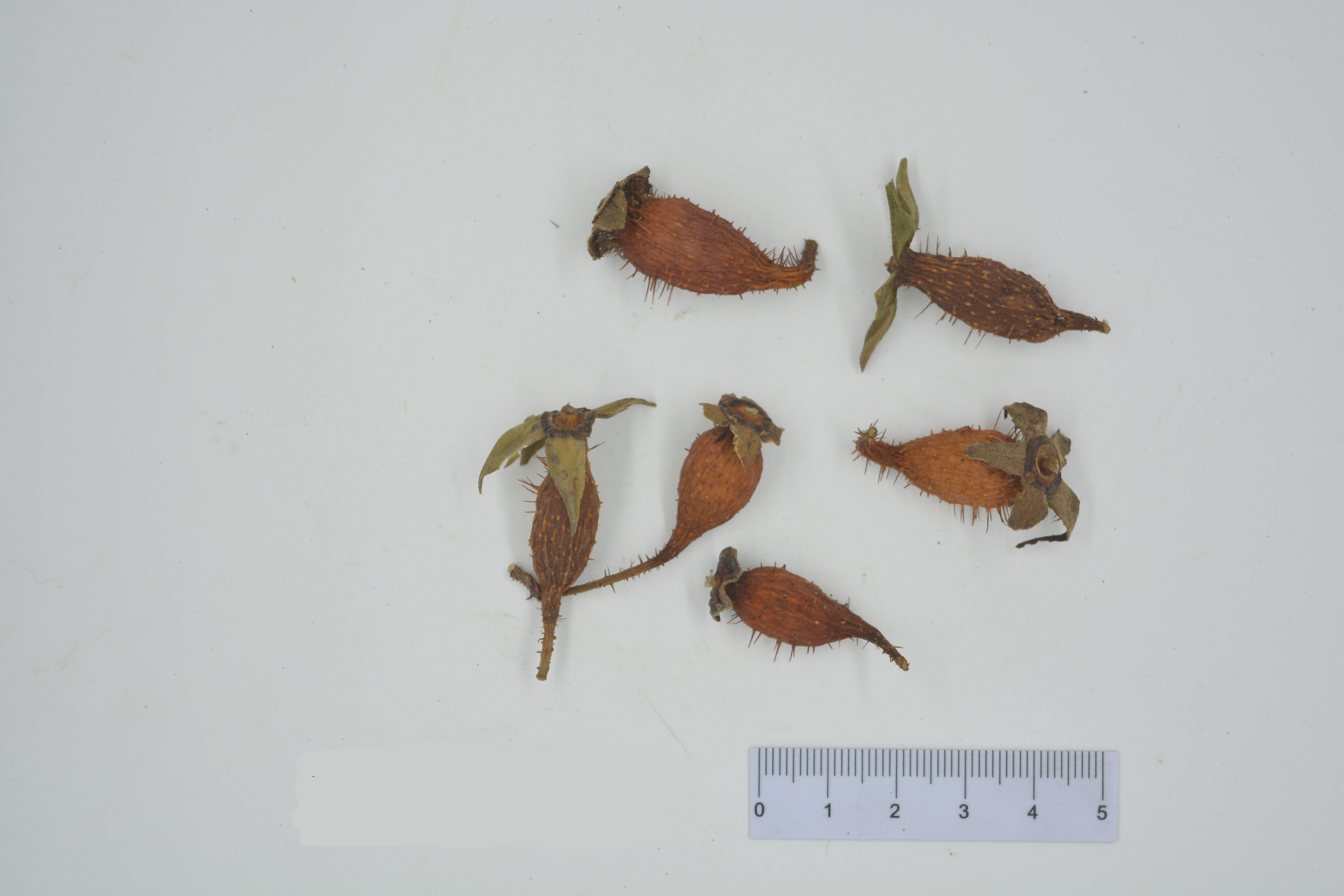 【性狀】本品為花托發(fā)育而成的假果,呈倒卵形,長2~3.5cm,直徑1~2cm。表面紅黃色或紅棕色,有突起的棕色小點,系毛刺脫落后的殘基。頂端有盤狀花萼殘基,中央有黃色柱基,下部漸尖。質(zhì)硬。切開后,花托壁厚1~2mm,內(nèi)有多數(shù)堅硬的小瘦果,內(nèi)壁及瘦果均有淡黃色絨毛。氣微,味甘、微澀。