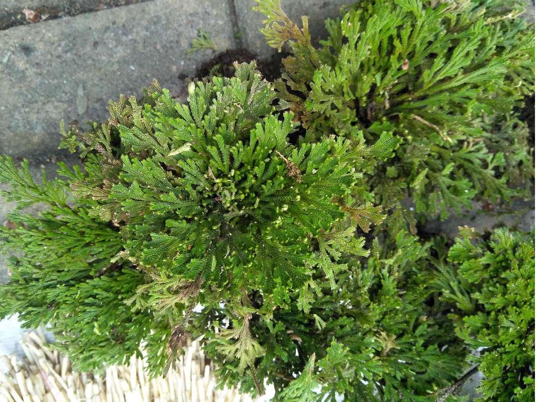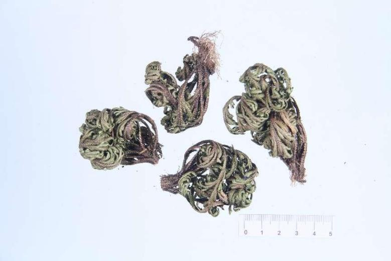 【性狀】卷縮似拳狀,長(zhǎng)3~10cm。枝叢生,扁而有分枝,綠色或棕黃色,向內(nèi)卷曲,枝上密生鱗片狀小葉,葉先端具長(zhǎng)芒。中葉(腹葉)兩行,卵狀矩圓形,斜向上排列,葉緣膜質(zhì),有不整齊的細(xì)鋸齒;背葉(側(cè)葉)背面的膜質(zhì)邊緣常呈棕黑色?;繗埩糇厣磷睾稚毟⑸蚓凵啥谈蔂?。質(zhì)脆,易折斷。氣微,味淡。